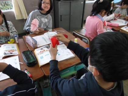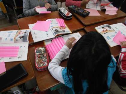 色紙をきれいに折るのが難しかったようですが,なんとかきれいなおうぎを作ることができました。