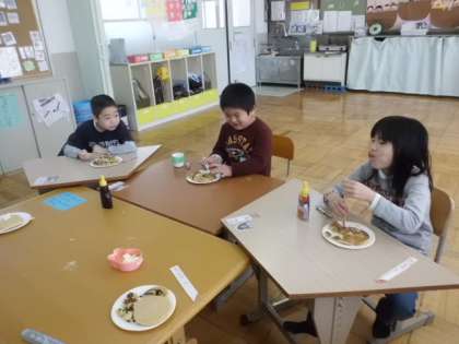 完成したホットケーキを「いただきます。」とってもおいしくできました♪