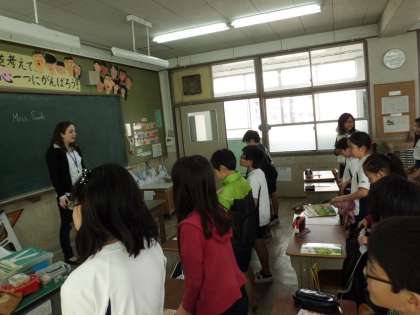 ALTのサラ先生と一緒に,授業のはじめと終わりのあいさつをしたり,ローマ字で自分の名前を書く練習をしたりしました。これからも,楽しく英語と親しんでいければと思います。