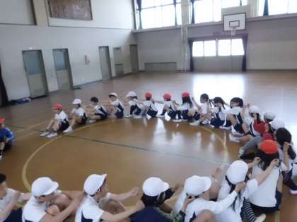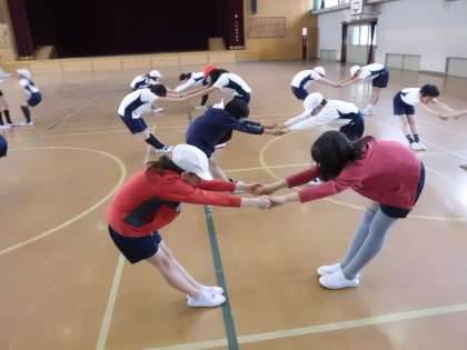 ほどよく体を伸ばしたり,円になって隣の人の肩をたたいたりして,友達とのコミュニケーションをとりながら,学習しました。