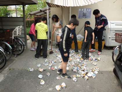 水曜日は,5年生が空き缶ふみの担当です。集まった空き缶を踏んで,小さくまとめました。