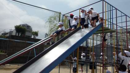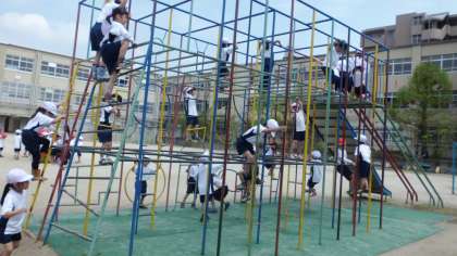子どもたちは,運動場にある総合遊具が大好きです。体育の時間には,友達と競うように上へ上へと登っていきます。滑り台の前では「ドキドキする!」と少し躊躇しながら滑っています。だんだんたくましくなっています。