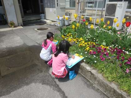 理科では,植物の観察をしています。虫眼鏡で細かい部分まで観察しています。もちろん,生活科で学習してきた目・耳・鼻・手での感覚も大事に観察しています。