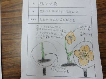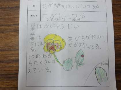 「葉っぱを触ったらざらざらしていたよ!」「葉が他の植物と違う形をしていたよ!」「よく見たら,細かい毛みたいなのがはえてたよ!」「におったら,なんかきゅうりみたいな匂いがしたよ!」など,色々なことに気づいて観察カードに記入していました。