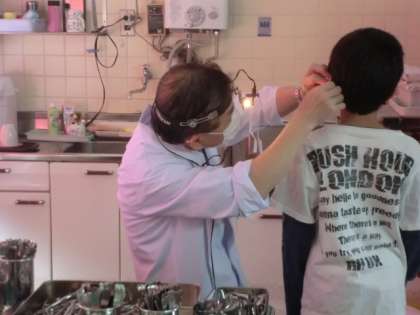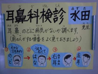 4月16日と18日の2日間,耳鼻科検診がありました。学校医の水田先生が,全校506名の耳・鼻・のどの様子を診てくださいました。