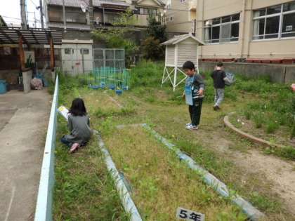 「春みつけビンゴ」をしました。つるつるの葉,いいにおいの花,てんとう虫,ちょう・・・五感を使っていろいろなものをさがして回りました。何か見つけると友だちにも教えてあげる姿もみられました。