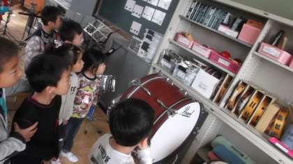 まだ学校にどんな部屋があるか分からない1年生。今日は音楽室へ探検に行きました。「たくさんの楽器があるなー」みんな興味津々でした。