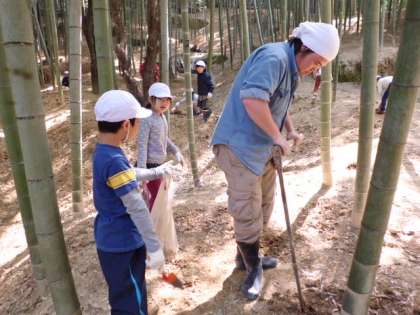 到着してすぐに、たけのこ掘りの場所を提供して下さった、たけのこ農家の方のお話を聞きました。たけのこは自然に生えてくるものではなく、山の手入れに大変手間と時間がかかります。説明や注意事項をよく聞いて、いよいよたけのこ掘りのスタートです!