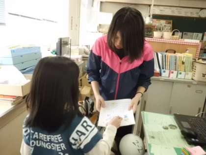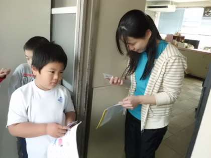 交流学級担任の先生にわかばカレンダーを渡しに行きました。緊張した顔で行きましたが,「ありがとう。」「かわいいカレンダーができたねえ。」などと声をかけてもらい,帰る時にはとても晴れやかな表情をしていましたよ。