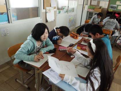 その前の事前学習として,総合の時間に『震災について』グループで課題を決め,調べ学習をしています。