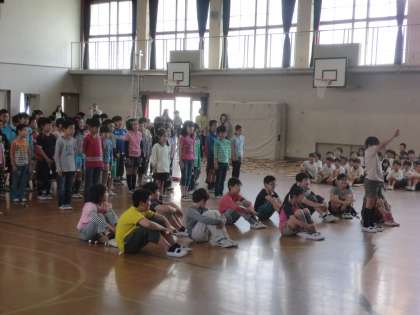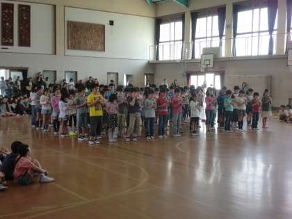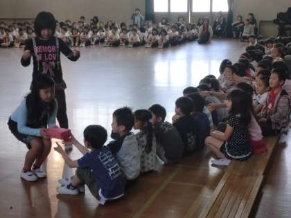 4年生からの出し物は,学校生活の劇とリコーダーで「笛星人」と「ハローサミング」を演奏しました。自分たちで作った「ぶんぶんごま」のプレゼントも渡しました。
