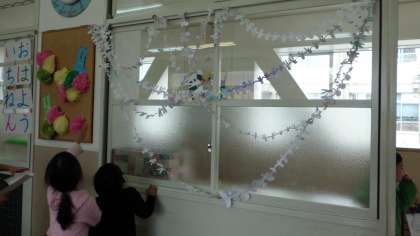 早速,作った飾りを飾ってみました。「うわー,きれい!」「長いのができたね。」と,飾りの周りに集まって,友達と楽しそうに鑑賞していました。