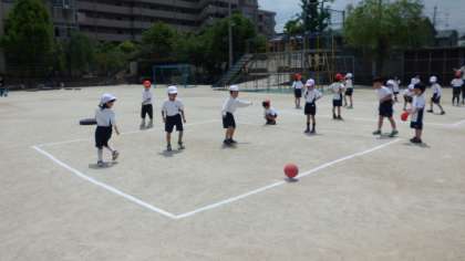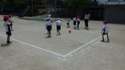 体育では,ころがしドッジボールをしています。ボールを転がして,コートの中にいる人に当てると,1点が入ります。だんだんルールにも慣れてきて,「早く転がして!」「後ろ,ボール来てるで!」とチームで声をかけあえるようになってきています。