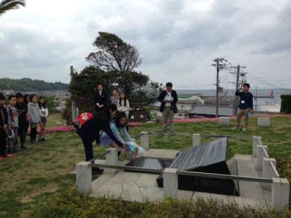 被災された方々の慰霊碑を前に追悼集会を行いました。