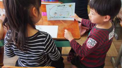 ペアになった1年生のお友達と,自己紹介をしたりゲームをしたりしました。