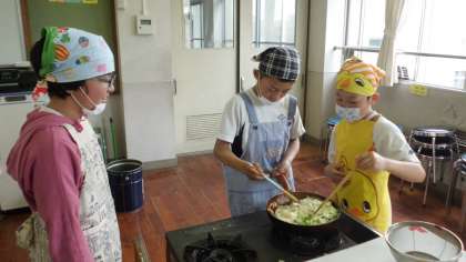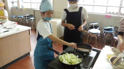 野菜炒めは,野菜の切り方を考えてグループで協力して作りました。