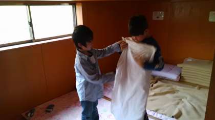 シーツをきれいにたたんで,今日の活動の準備をします。