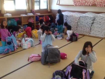 90畳の部屋で,下りてきた人から,荷物整理です。まだ,みんな寝ぼけ眼です。