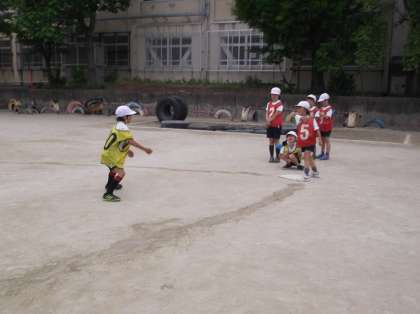 ホームランを打つ人も出てきました。あがったフライをノーバウンドで取ってアウトにしたり,1塁に投げてアウトにしたりすることも,少しずつできるようになってきています。