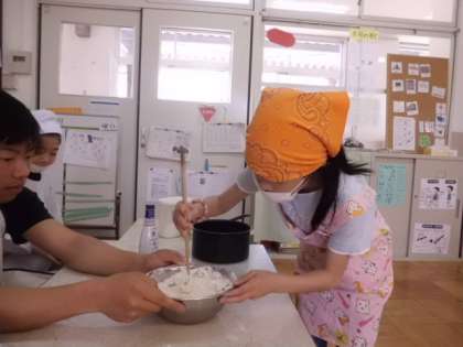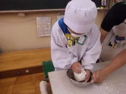 5月のお楽しみ会でみたらし団子を作りました。まずは粉にぬるま湯を入れて耳たぶくらいのやわらかさになるようにこねました。