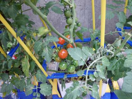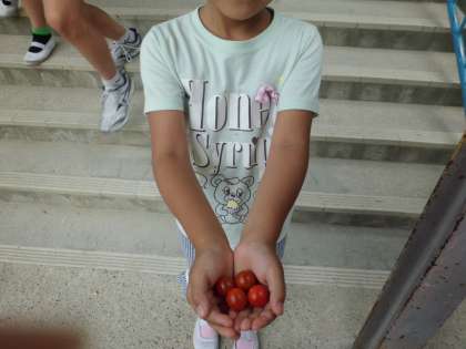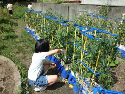 子どもたちが大切にお世話しているミニトマトの実が色づき始めています。