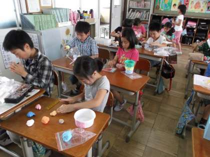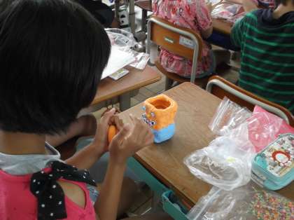 一人一人が用意してきた容器に色粘土をつけた後,ビーズやモール,ビー玉などで飾り付けしました。
