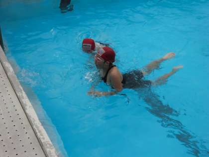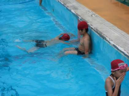 平泳ぎコースでは,手のかきかたの練習やキックの仕方を壁に,手をかけながら練習したり,友だちにアドバイスを受けたり,工夫をしながら練習していました。