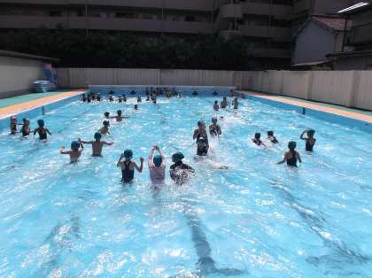 先週は低水位水泳で,水に慣れることや楽しく水遊びをすることをめあてとして学習しました。