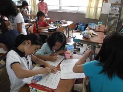 友達の作品を見て感じたことや,自分の作品の工夫したところなどを鑑賞カードに書きました。