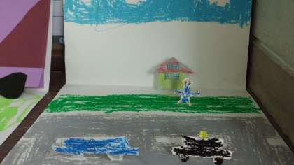 図工「おって たてて ゆめのまち」では,紙を折って立てる仕組みを使って作品を作っています。自分の作ったものに合わせて,背景も作りました。