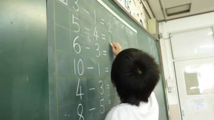 算数では,たしざんの学習が終わり,ひきざんの学習に入っています。数図ブロックを動かしたり,指折り数えたりして,答えを考えています。