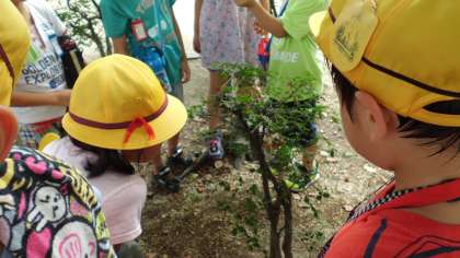 「先生来て来て!セミがいたで!」と呼ばれ,行ってみると……なんと,殻から出てきたばかりのセミが!6年間も土の中にいて,ようやく地上に出てきたアブラゼミ。まだ羽根の筋も薄い黄緑。生まれたての美しさにみんな感動していました。
