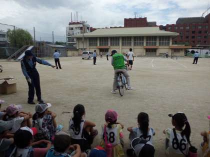 伏見警察署の方や,地域の方にお手伝いいただいて,運動場に作られたコースを走ります。