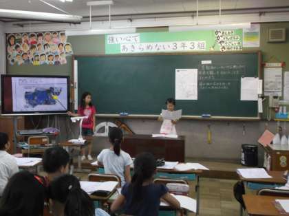 京都駅,神社や文化施設の集まっているところ,住宅の多いところなどについて,調べたことを発表しています。