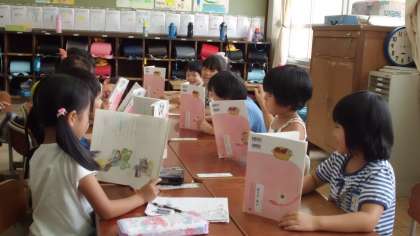 国語「おおきなかぶ」では,グループになって役やセリフを相談して決めています。決めたグループから練習し,文章を暗記している子もたくさんいます。