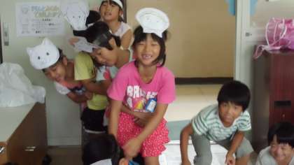 セリフが上手に言えるようになったので,動きをつけています。だんだん劇らしくなってきました。お面も付けて,みんな役になりきっています。