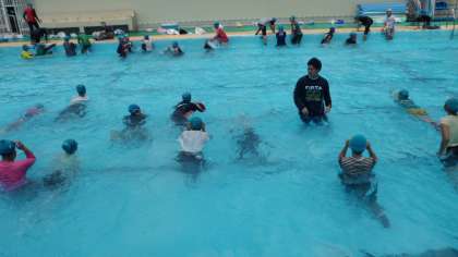 万が一の水の事故に備えて着衣泳の学習をしました。上下,服と靴下を着衣した状態で水の中に入ると,いつもと違って体が重くなったり,泳ぎづらくなったりすることを知ることで,もしも自分が水難事故にあった時にどのように行動すれば良いのかを考えることができました。