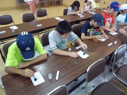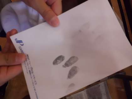 鑑識の指紋採取のやり方を教えてもらい,実践しました。