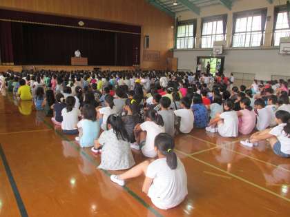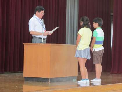 朝の集いのあと,水泳記録会や部活動の大会の表彰式がありました。