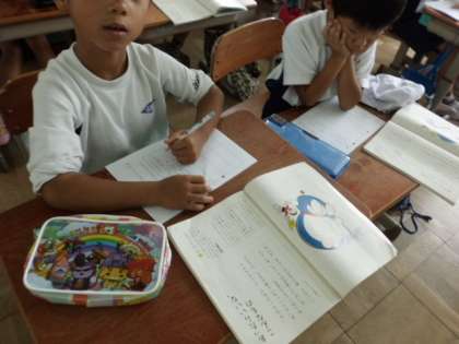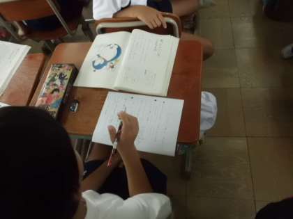 国語の学習では,みんなが大好きな「ドラえもん」の道具をもとに,「こんな道具があったらいいな〜」という道具を考え,発表する学習をしています。