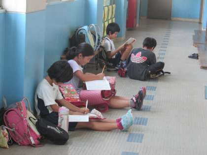 放課後の順番の子どもたちは,宿題?をして待っているようです。今日までで,1組28名と,2組21名が終了しました。