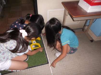 まきじゃくを使って,南校舎の廊下の端から端までの長さを測ってみました。