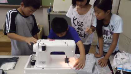 5年生でミシン縫いを学習して以来,久しぶりの裁縫です。グループで教え合いながら意欲的にエプロン作りに取り組んでいます。