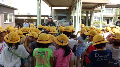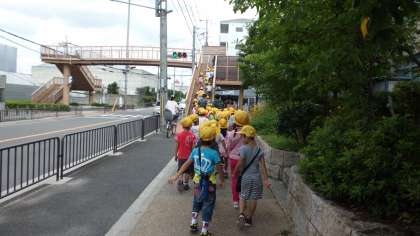 生活科の学習で,深草西浦南公園へ虫とりに行きました。まずは,先生から安全についてのお話。車や自転車に気をつけて,公園まで向かいましょう。