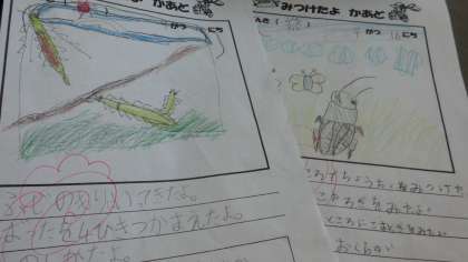 「公園の草がくすぐったかったけど,いっぱい虫がとれて嬉しかった。」「今まで虫がきらいだったけど,好きになったよ。」「こおろぎを初めて見て,びっくりしたよ。」と,今日の記録とともに,虫の観察を書いていました。