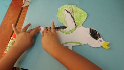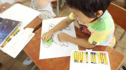 図工では,お話の絵を描いています。今日は,「ペンギーノとたのしいなつやすみ」という絵本を読んで,そのお話の好きな場面を描きました。主人公のペンギンを大きく描くように意識していました。