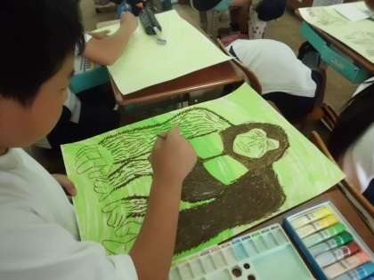 今日は,学習を始めて3時間目,ゴリラの毛並みを工夫して描くところをしました。