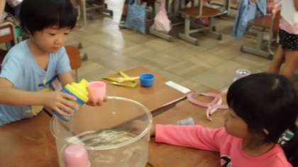 算数「かさくらべ」では,自分の水筒のかさを友達の水筒と比べました。「コップ何杯分入ったかで比べられるよ。」「コップはいっぱいにしないといけないよ。」「高さが高かったのに,予想より少なかったよ。」などと,お話していました。