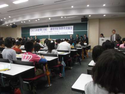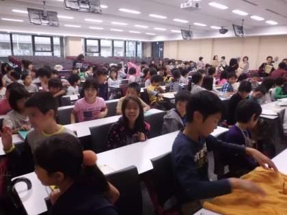大学の中はきれいで,開会式のある講義室は大きくて大興奮の子どもたち。