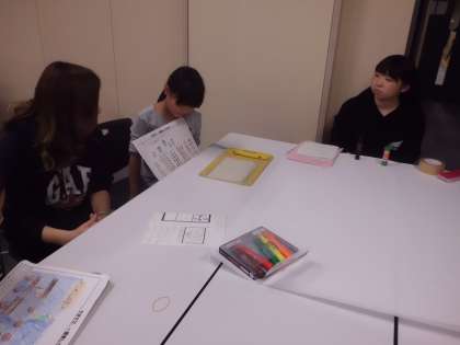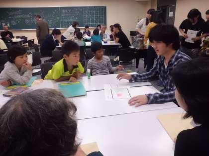 話し合いは,各グループに子どもたちが3人ずつ入り行われました。